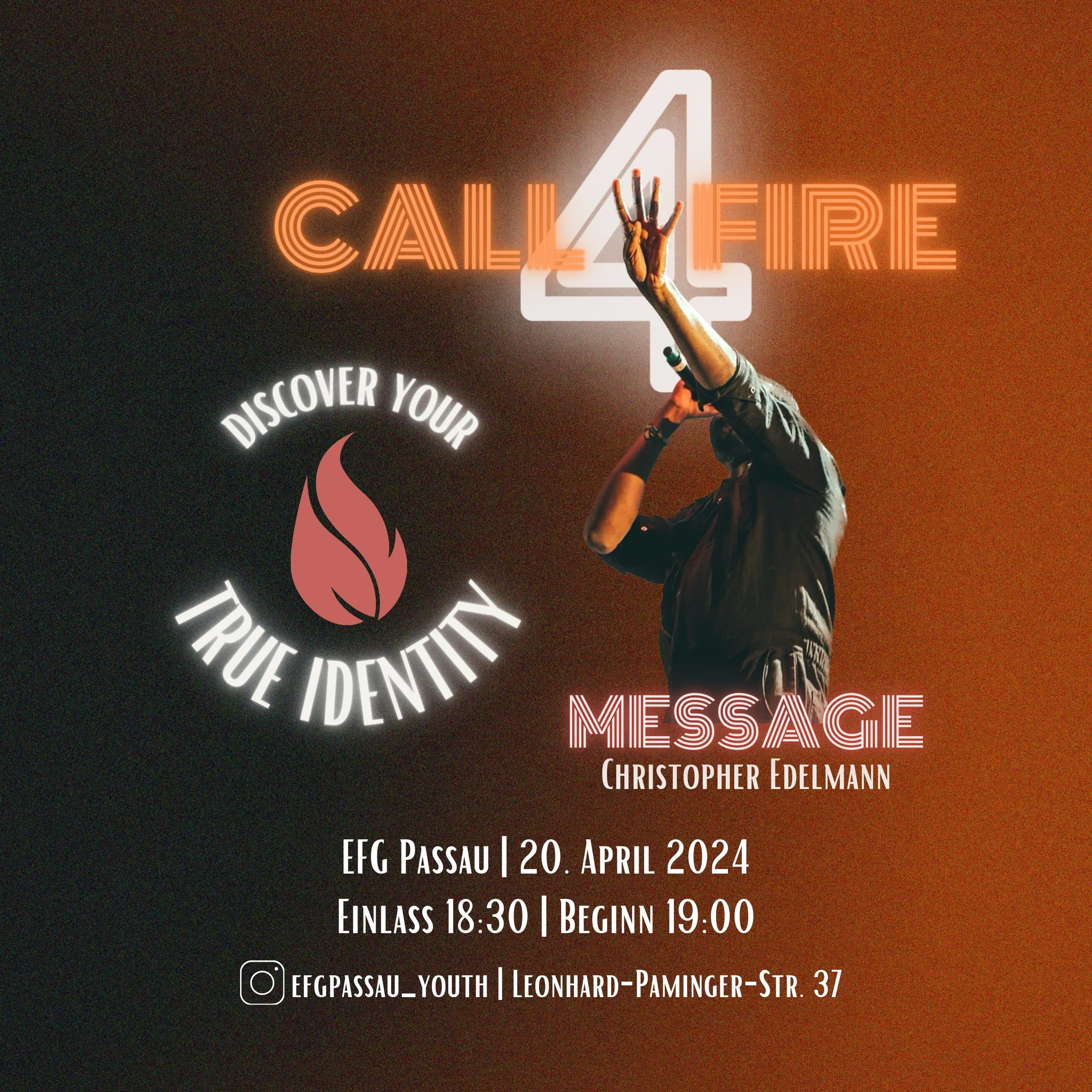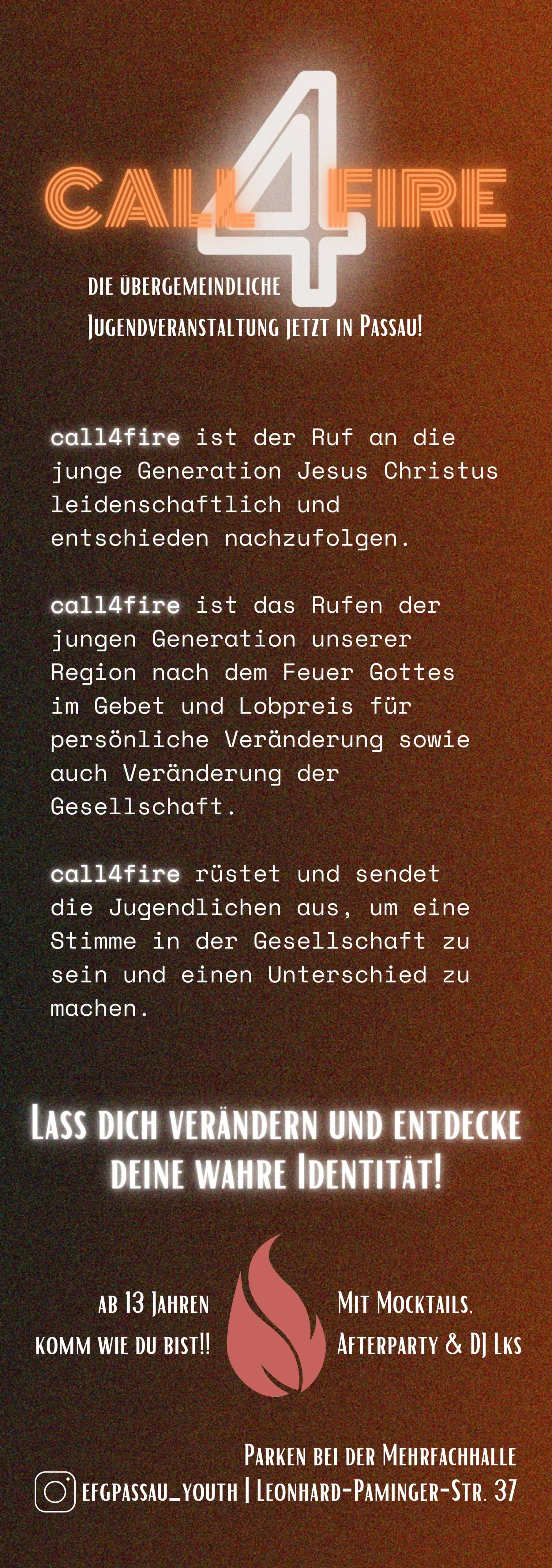 Call4fire ist eine übergemeindliche Jugendveranstaltung mit dem Ziel die Jugendlichen in unserer Region zusammen zu bringen, um gemeinsam nach dem Feuer Gottes im Gebet und Lobpreis zu rufen, für persönliche und gesellschaftliche Veränderung. Die Jugendlichen sollen erkennen und erleben, dass Jesus Christus leidenschaftlich und entschieden nachzufolgen, in unserer heutigen Zeit mehr als relevant und wichtig ist.
